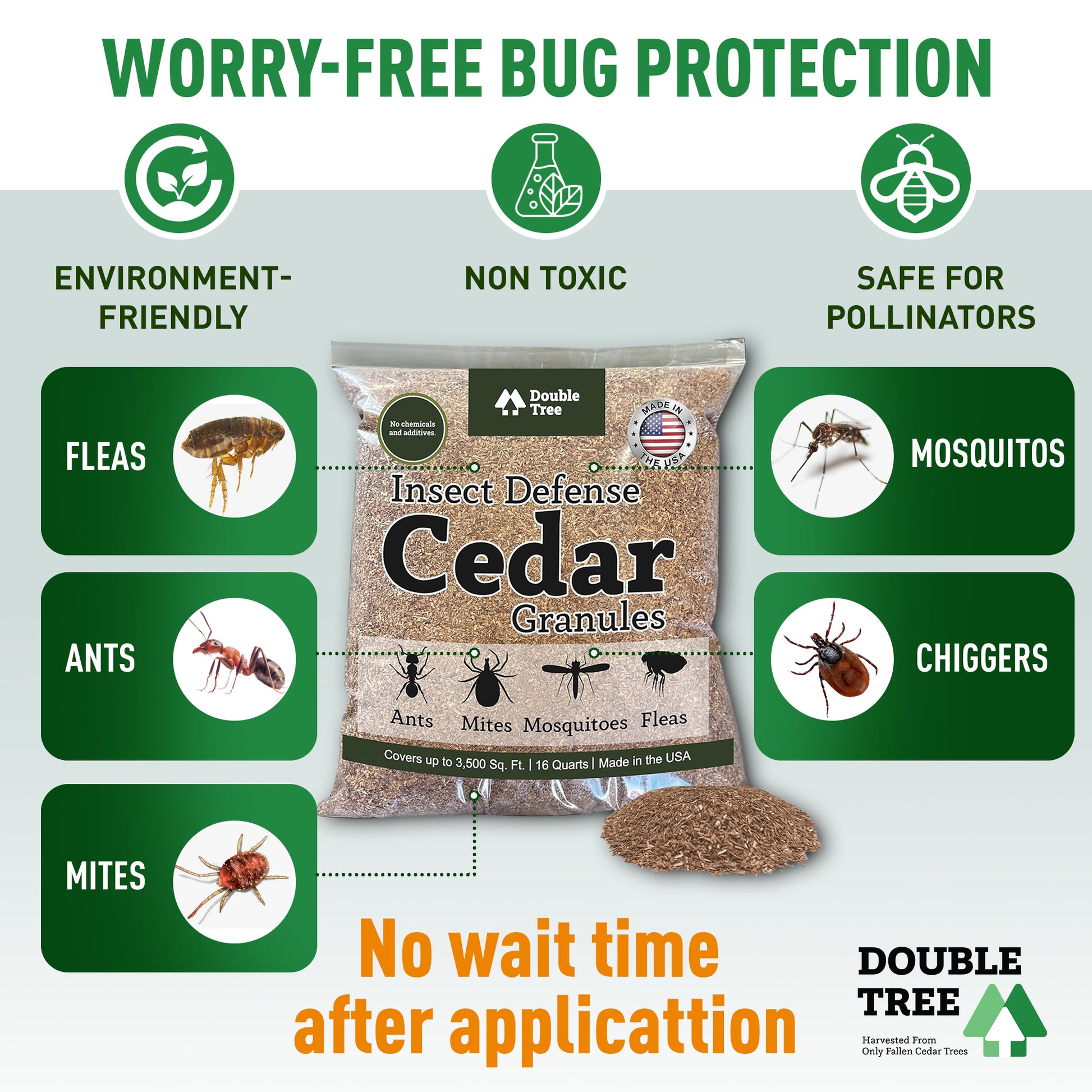- Welcome to a world where you can enjoy your outdoor spaces without the constant annoyance of pesky insects. Introducing Double Tree Forest Products Insect Repelling Cedar Granules, your ultimate solution for a bug-free environment. This product is designed to repel a wide range of insects, including mosquitoes, fleas, chiggers, and more. The secret lies in the natural aroma emitted by the cedar granules, which acts as a powerful deterrent, keeping your surroundings insect-free without posing any harm to your family or the environment.